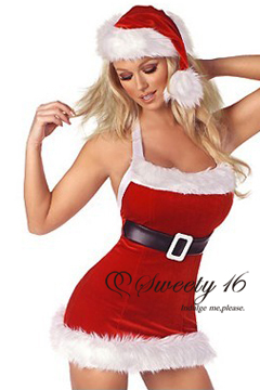 Sexy Santa outfit includes velvet trimmed dress with built-in belt and Christmas hat.